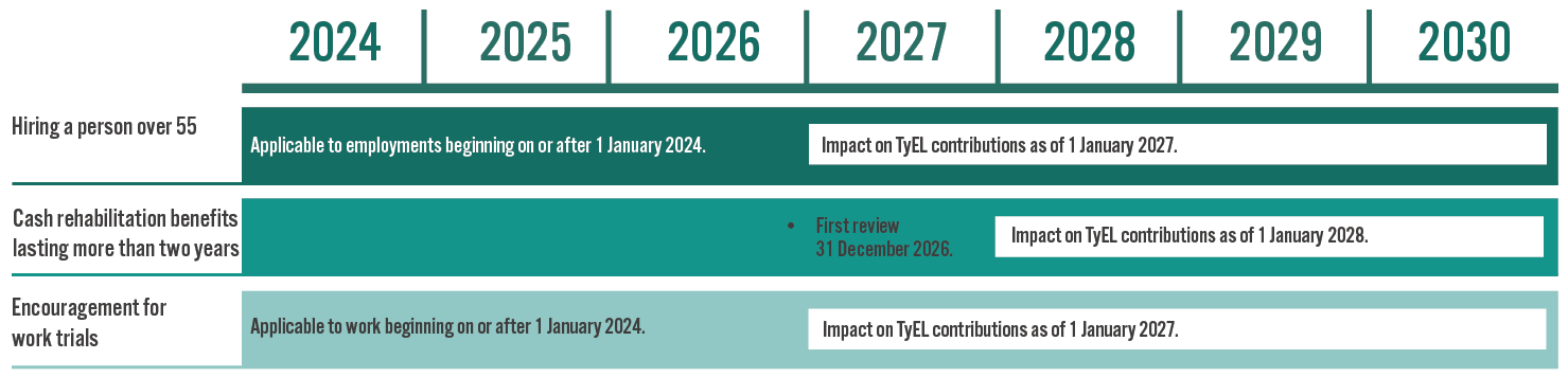 The disability of a person who was hired as a new employee over the age of 55 will not have an impact on the contribution category. The change applies to employment relationships that begin on or after 1 January 2024. Any change in the contribution category will be realised, at the earliest, in 2027.