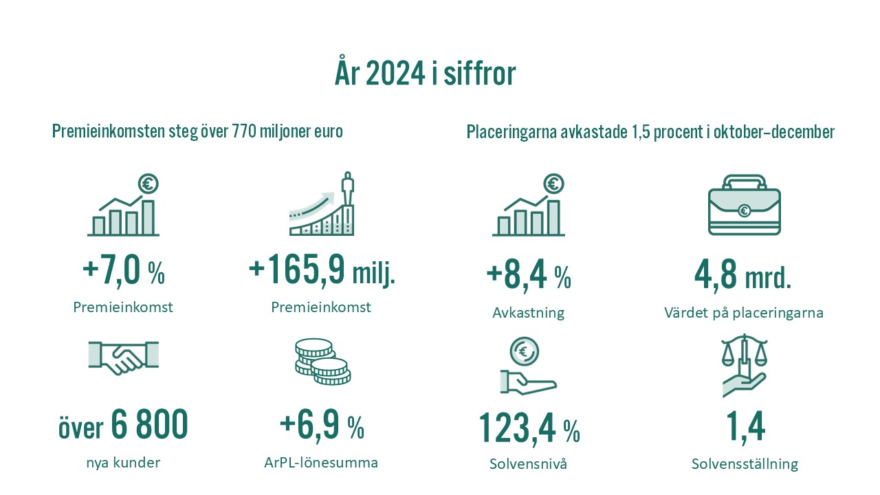 Veritas premieinkomst ökade med 7 procent jämfört med året innan, till 774,6 (724,1) miljoner euro. ArPL-lönesumman i de företag som Veritas försäkrar växte under året med 6,9 (4,4) procent.