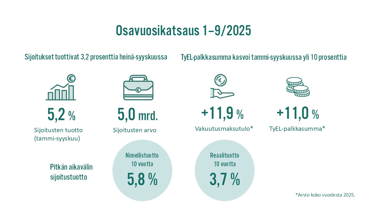 Työeläkeyhtiö Veritaksen sijoitukset tuottivat 5,2 prosenttia tammi-syyskuussa ja 3,2 prosenttia vuoden kolmannella neljänneksellä. Veritas on kasvanut vuoden aikana vahvasti, ja vakuutusmaksutulon arvioidaan kasvavan lähes 12 prosenttia kuluvana vuonna.