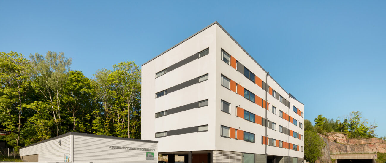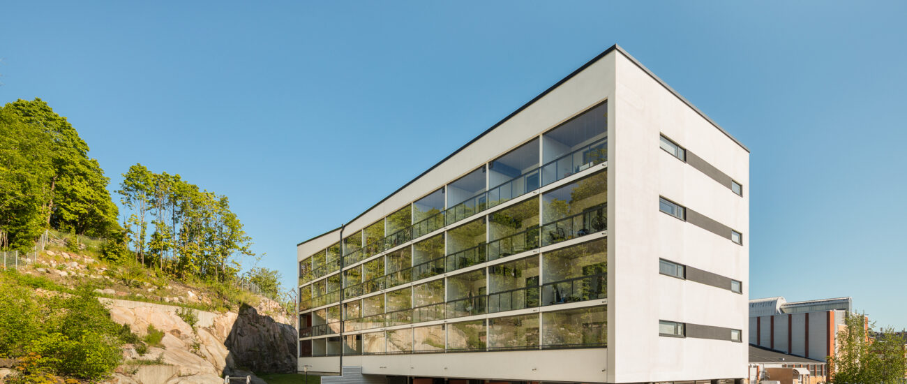 Vuonna 2017 valmistuneen kiinteistön julkisivu on valkoinen rappaus, jota täydentävät harmaan sekä puun värisävyt. Värimaailma sulautuu hyvin ympäristöön, joka koostuu puisto- sekä kalliomaisemista.