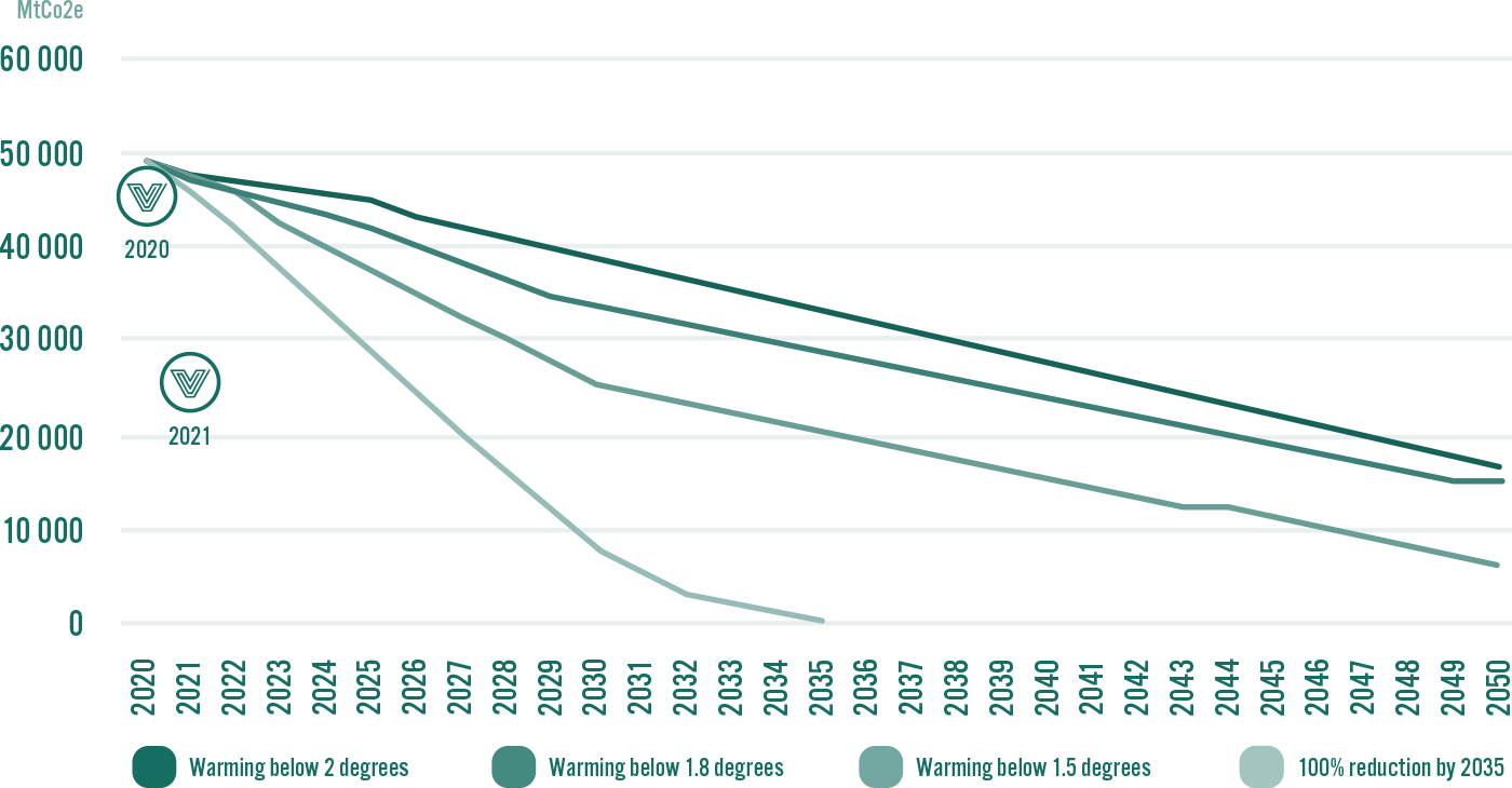 The below graph proportions Veritas’ investment portfolio in four different scenarios. The different warming scenarios (1.5, 1.8 and 2-degree) indicate by how much emissions should be reduced for global warming to remain at the degree indicated by the name of the scenario. In these scenarios, carbon neutrality must be attained latest in 2050. The latest scenario accords to Veritas’ carbon neutrality target, i.e., emissions should be reduced by 100 per cent by the year 2035.