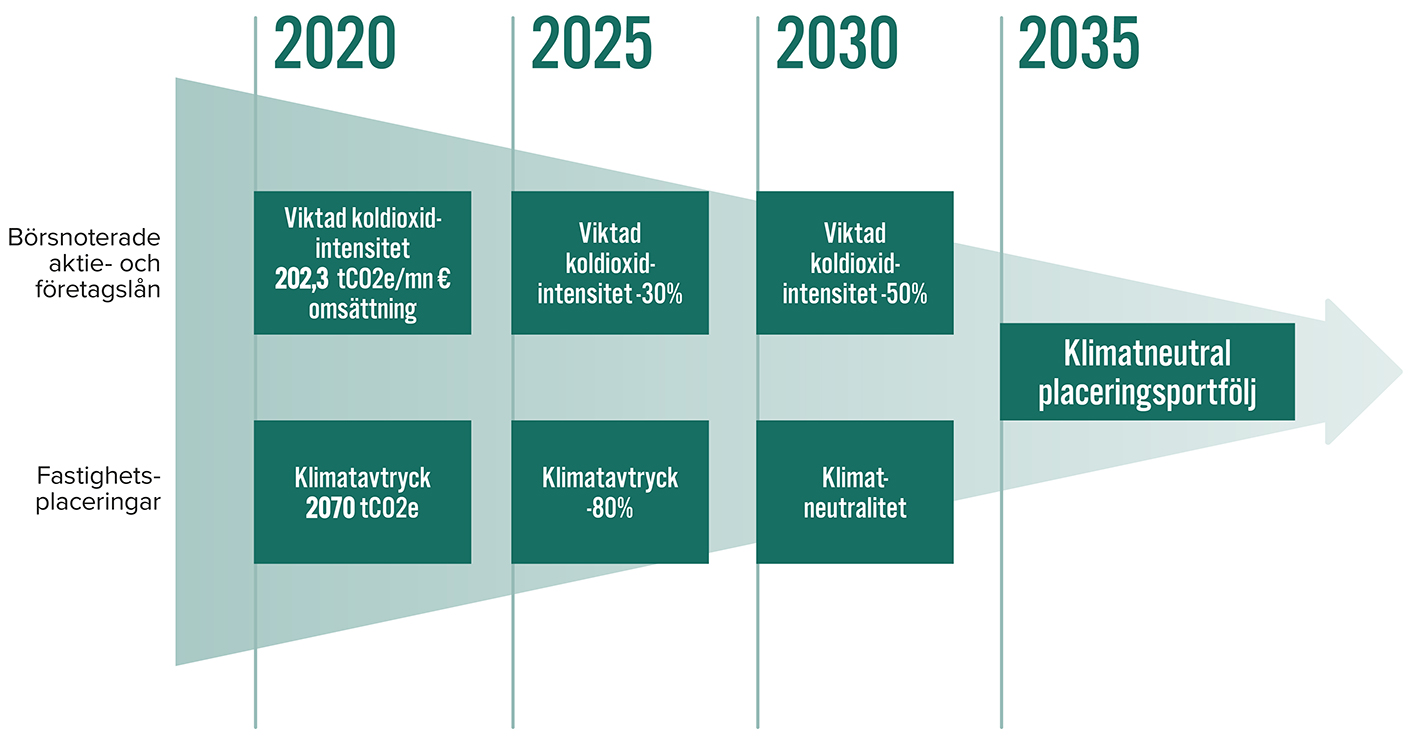 Vi har utarbetat en klimatpolicy för placeringar där vi fastställer åtgärderna för att hantera klimatriskerna i vår placeringsportfölj. År 2021 kompletterade vi vår klimatpolicy med en klimatfärdplan där vi har fastställt åtgärderna för att uppnå klimatmålen.
